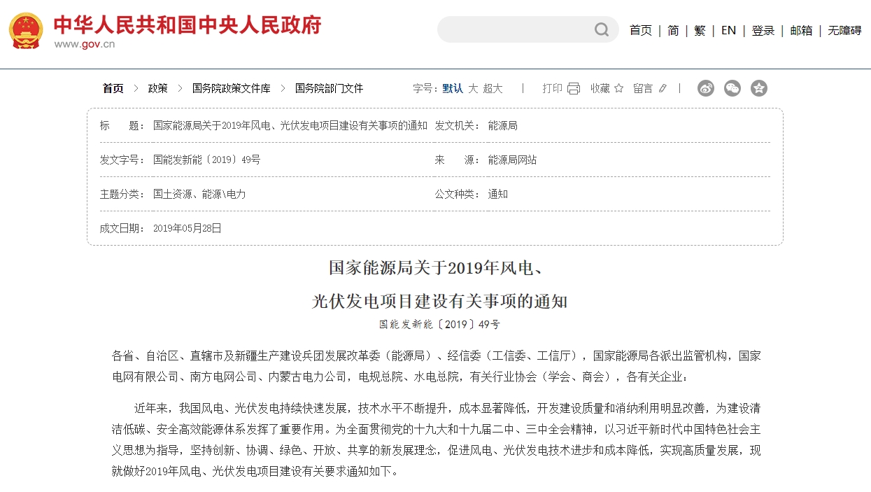 國家能源局關于2019年風電、 光伏發電項目建設有關事項的通知